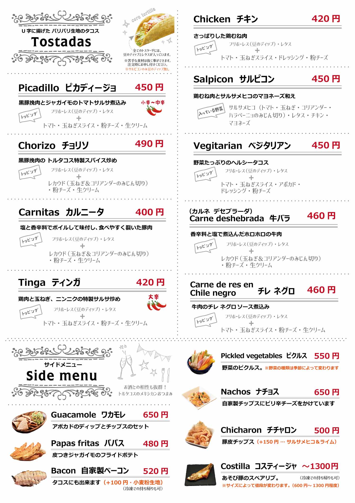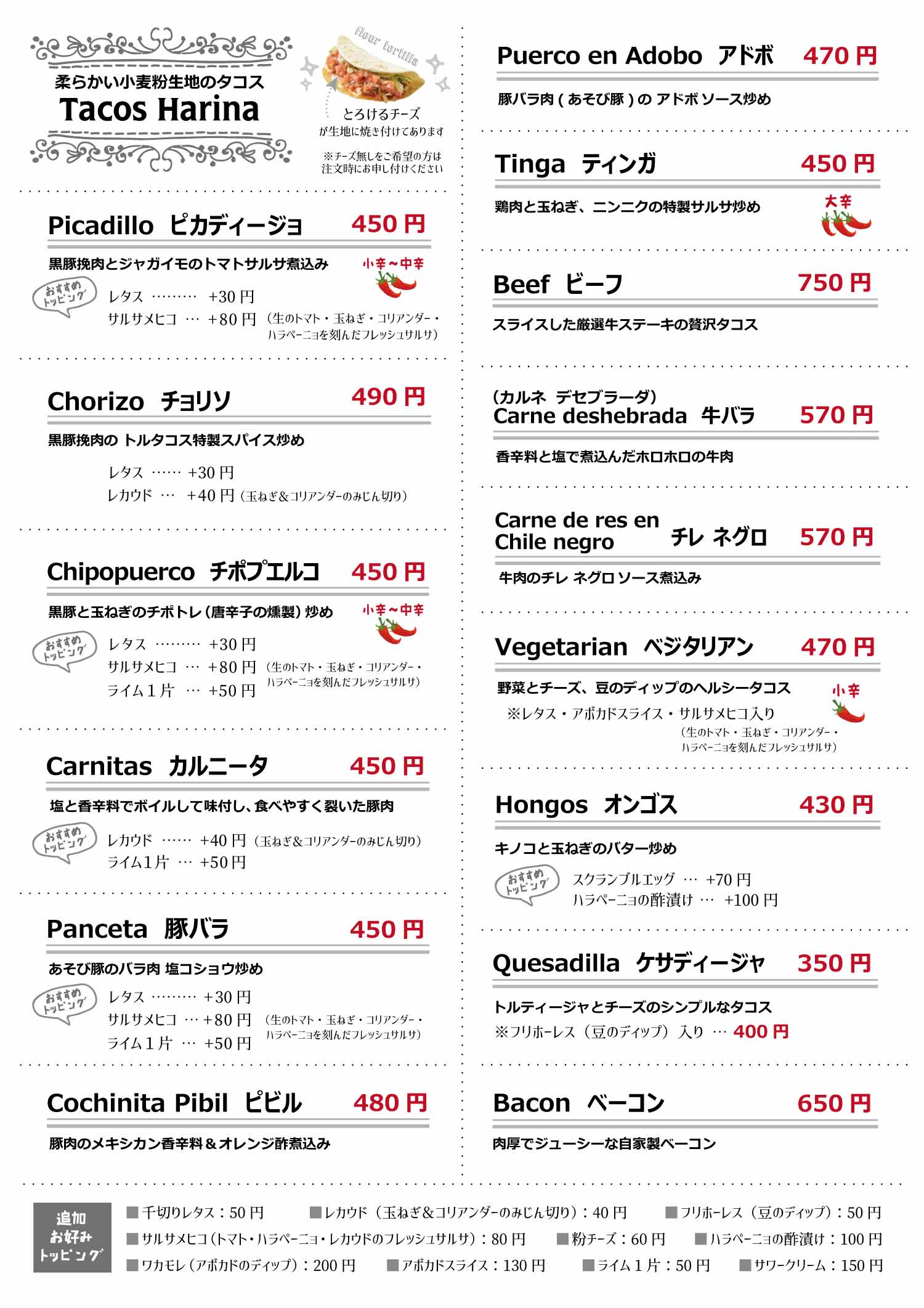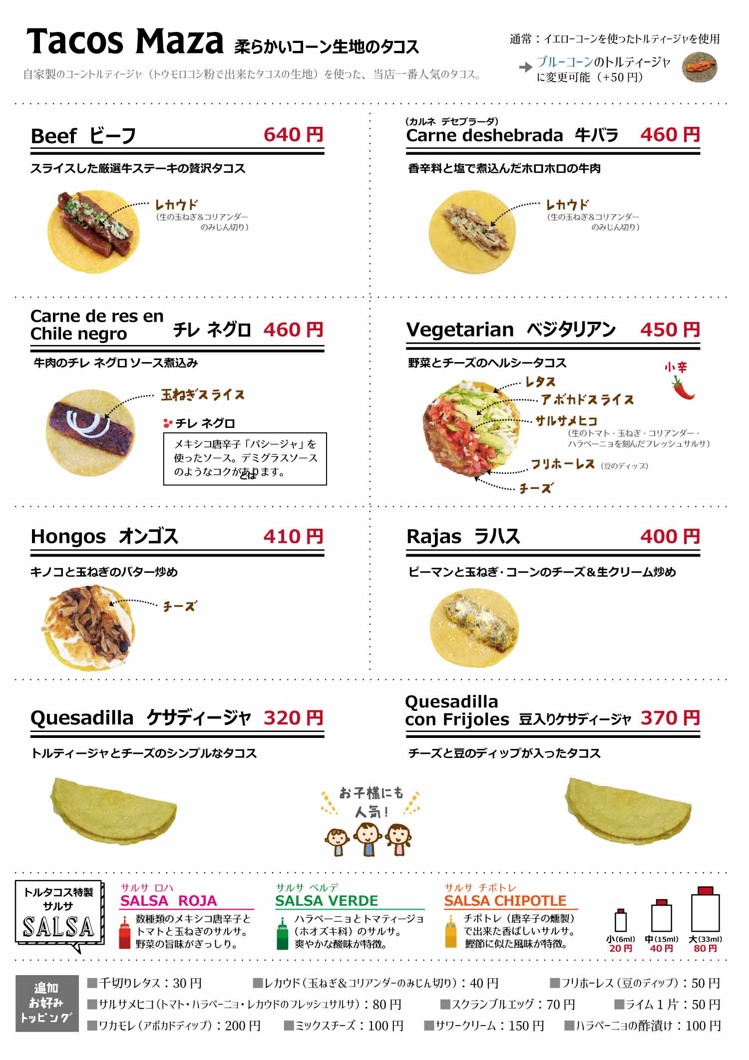 テイクアウト用のU字型のハードタコスです。生地はコーン生地で日本人が一番イメージしているタコスです。 メキシコのおつまみメニューも載っています。