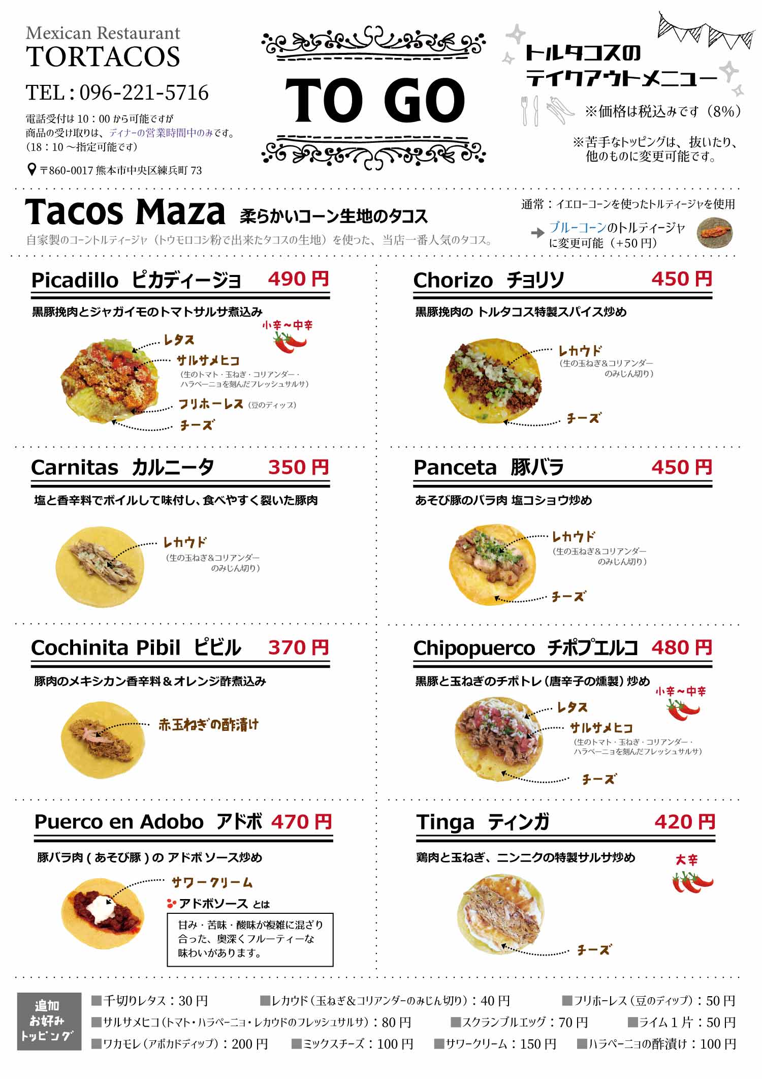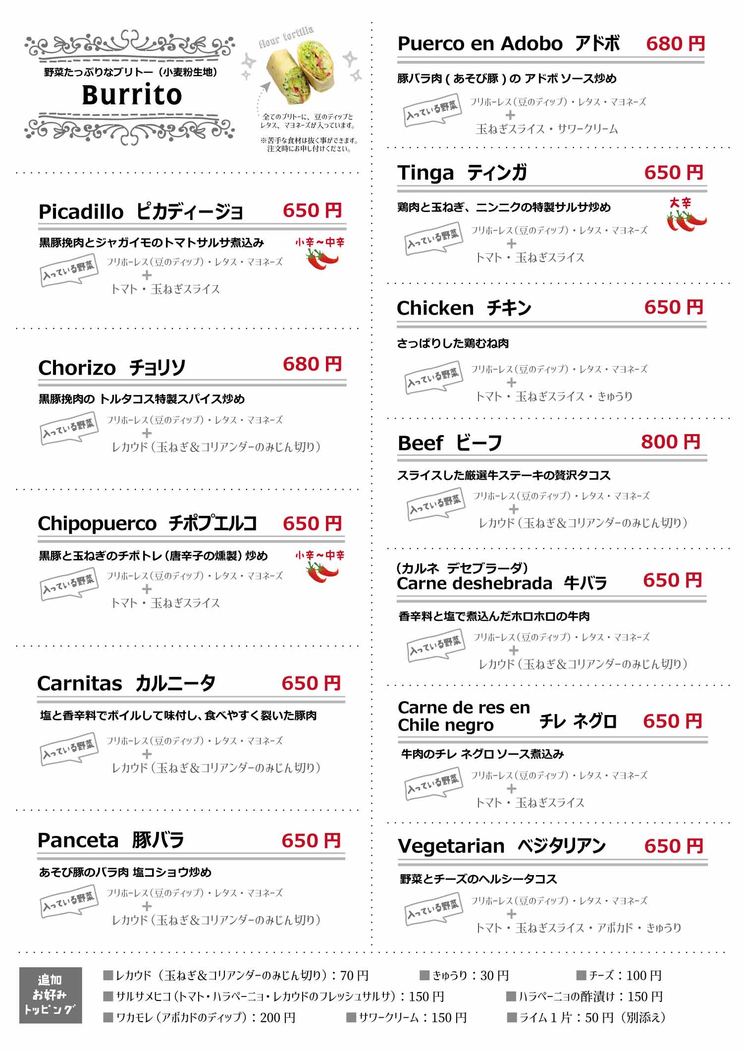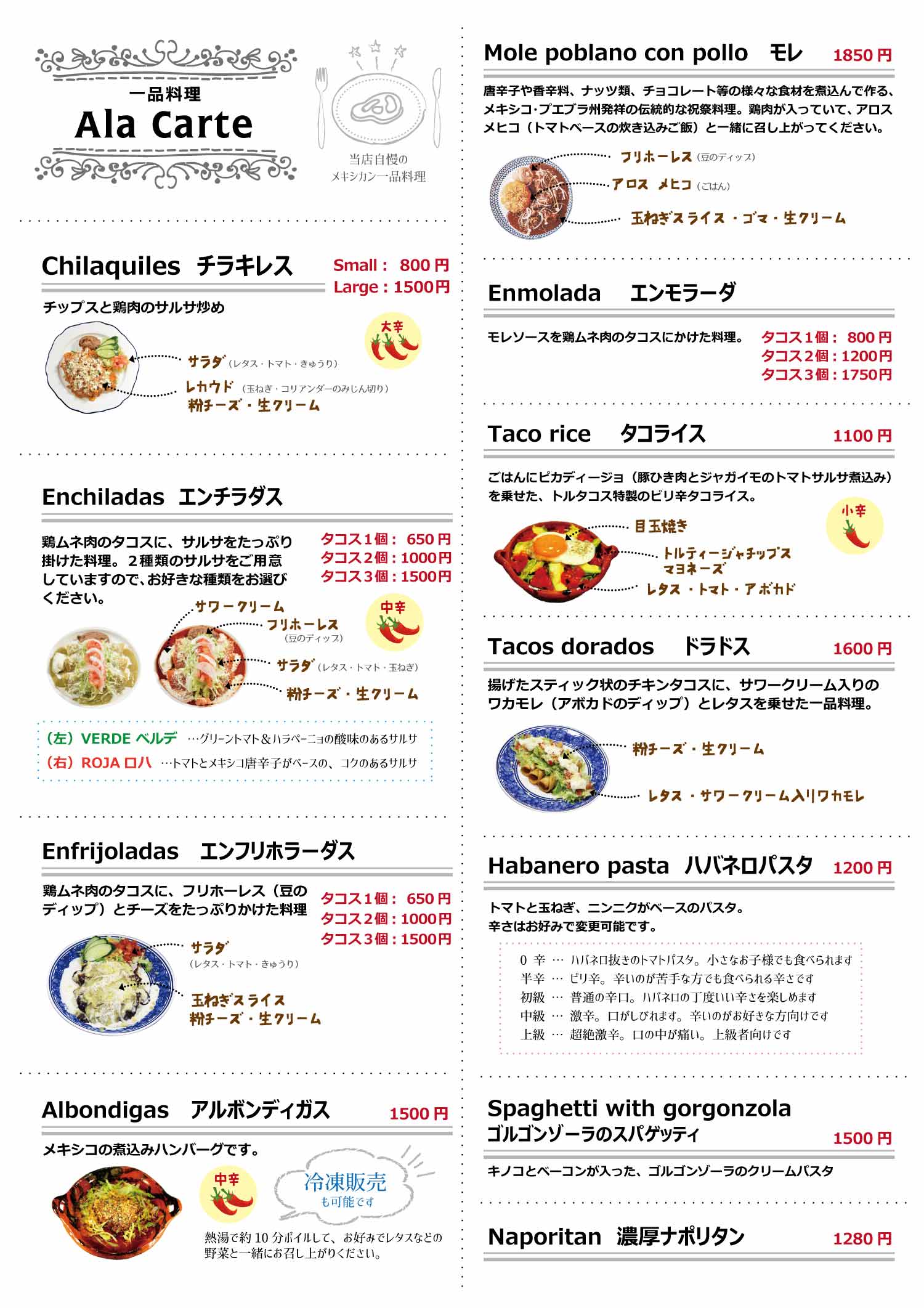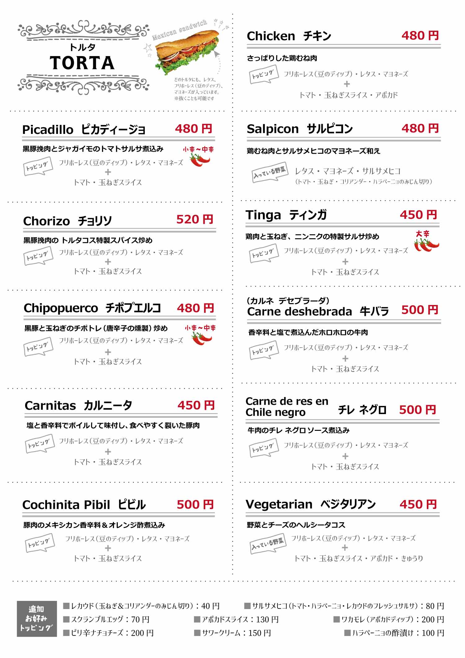 テイクアウト用のU字型のハードタコスです。生地はコーン生地で日本人が一番イメージしているタコスです。 メキシコのおつまみメニューも載っています。